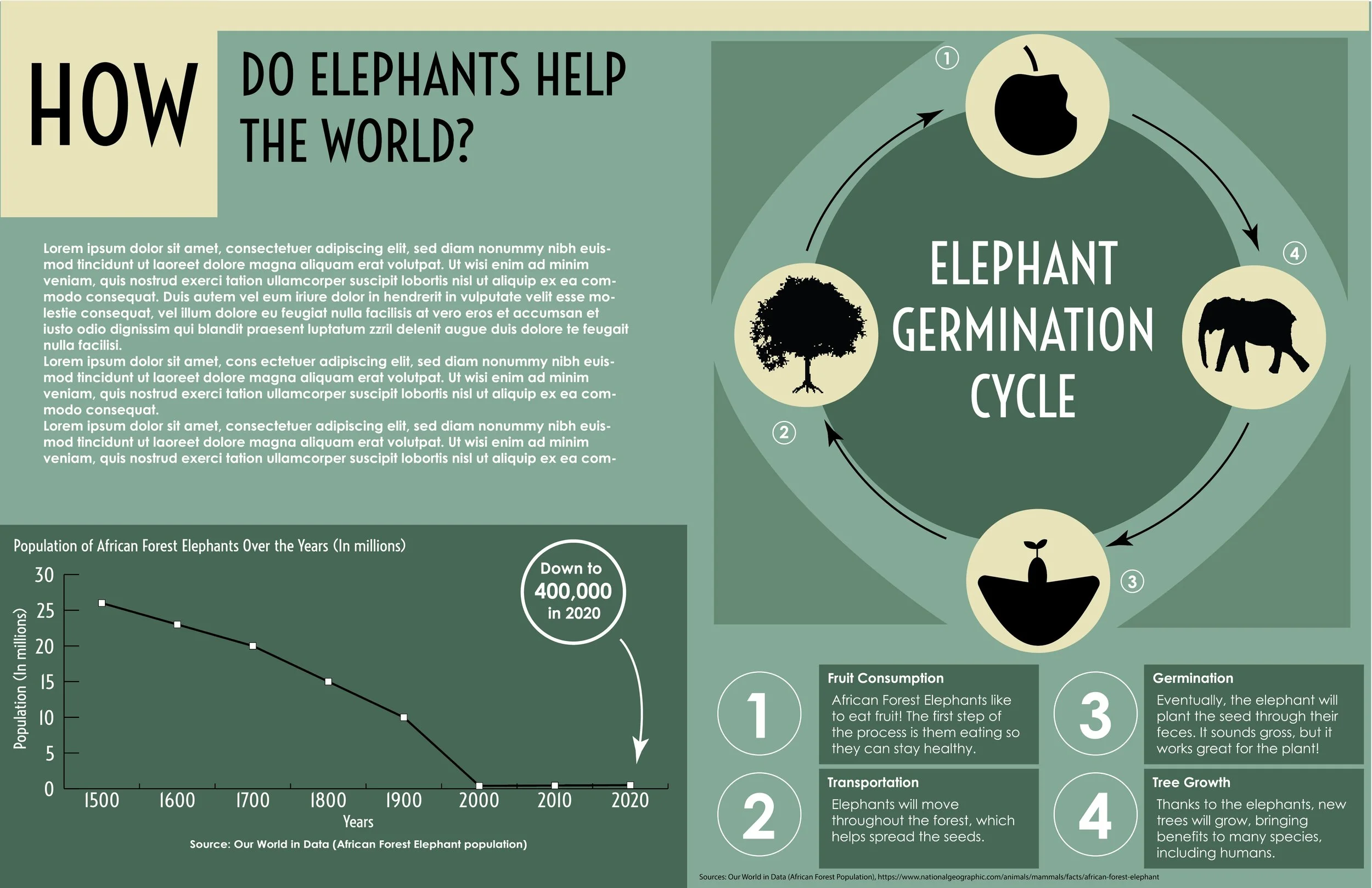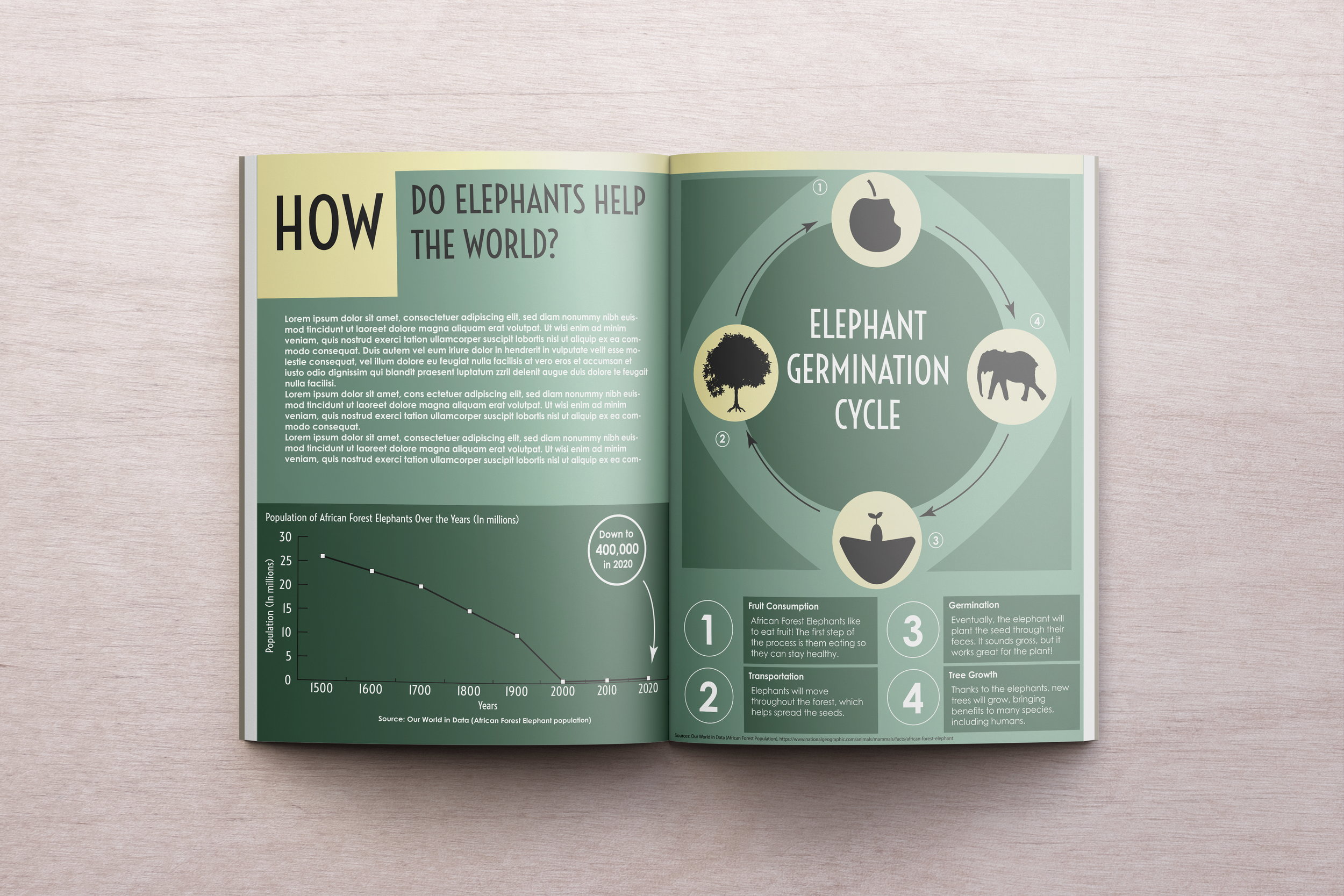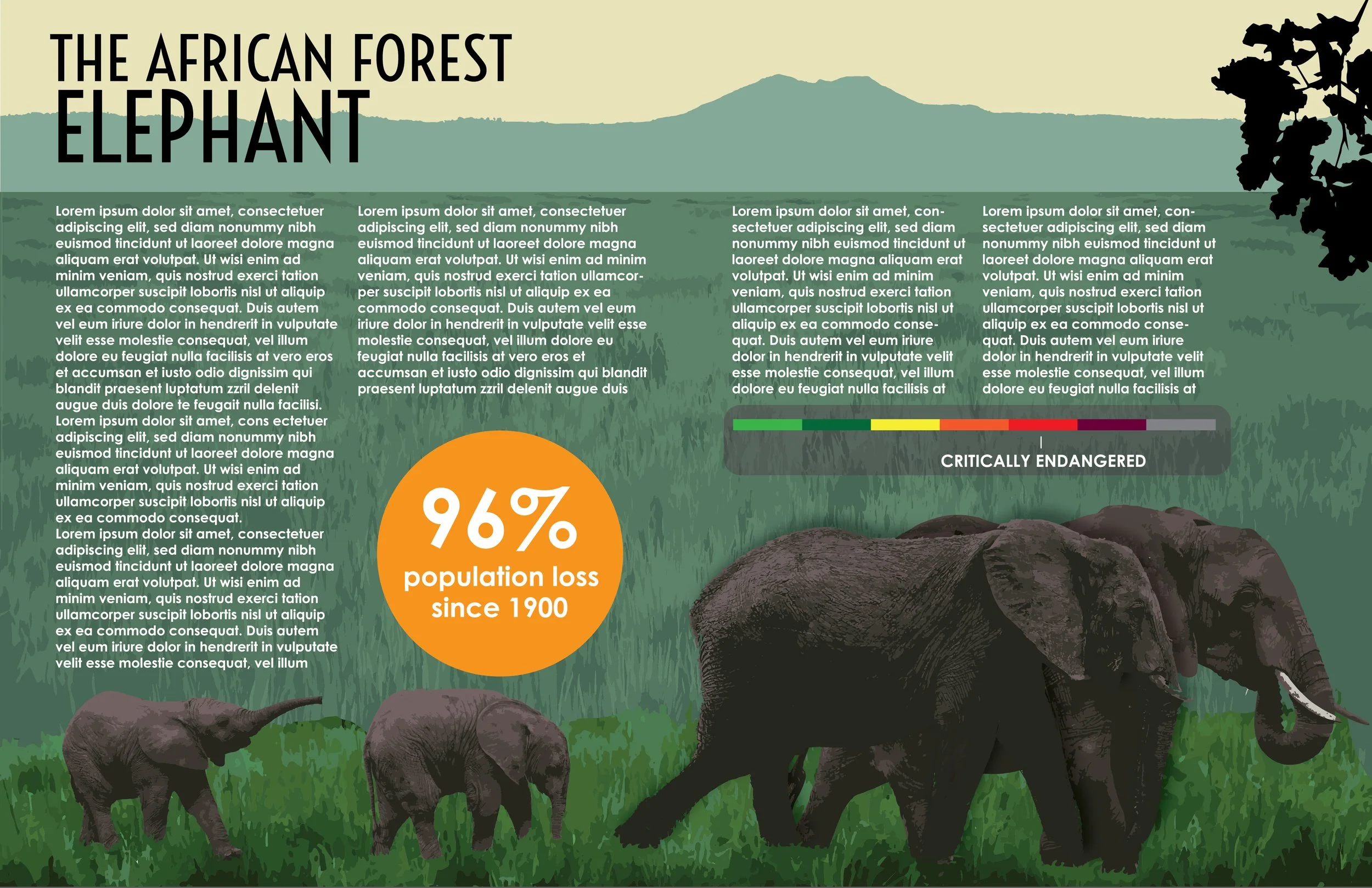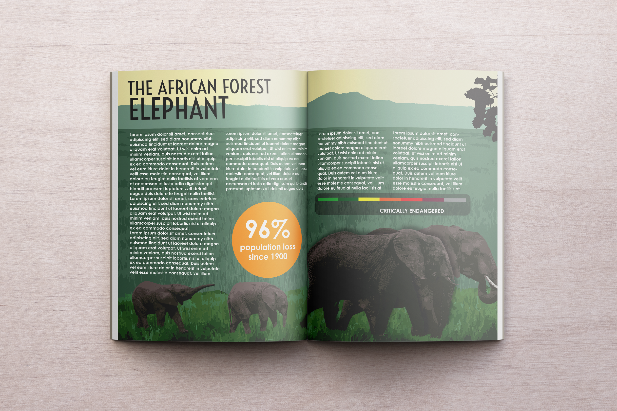 This is an infographic concept that I created that helps bring attention the African Forest Elephant, which is an endangered species. It does an amazing job at bringing an attractive layout, while keeping the information visible. Graphs and text is set to be an easy read for both children and adults.