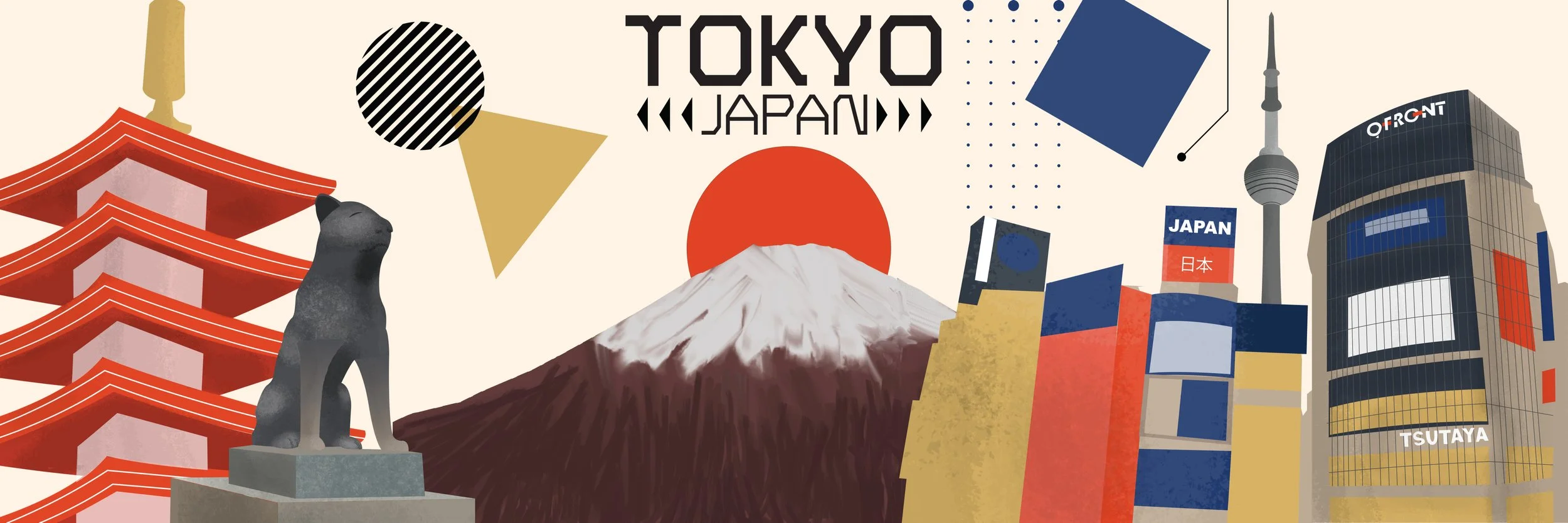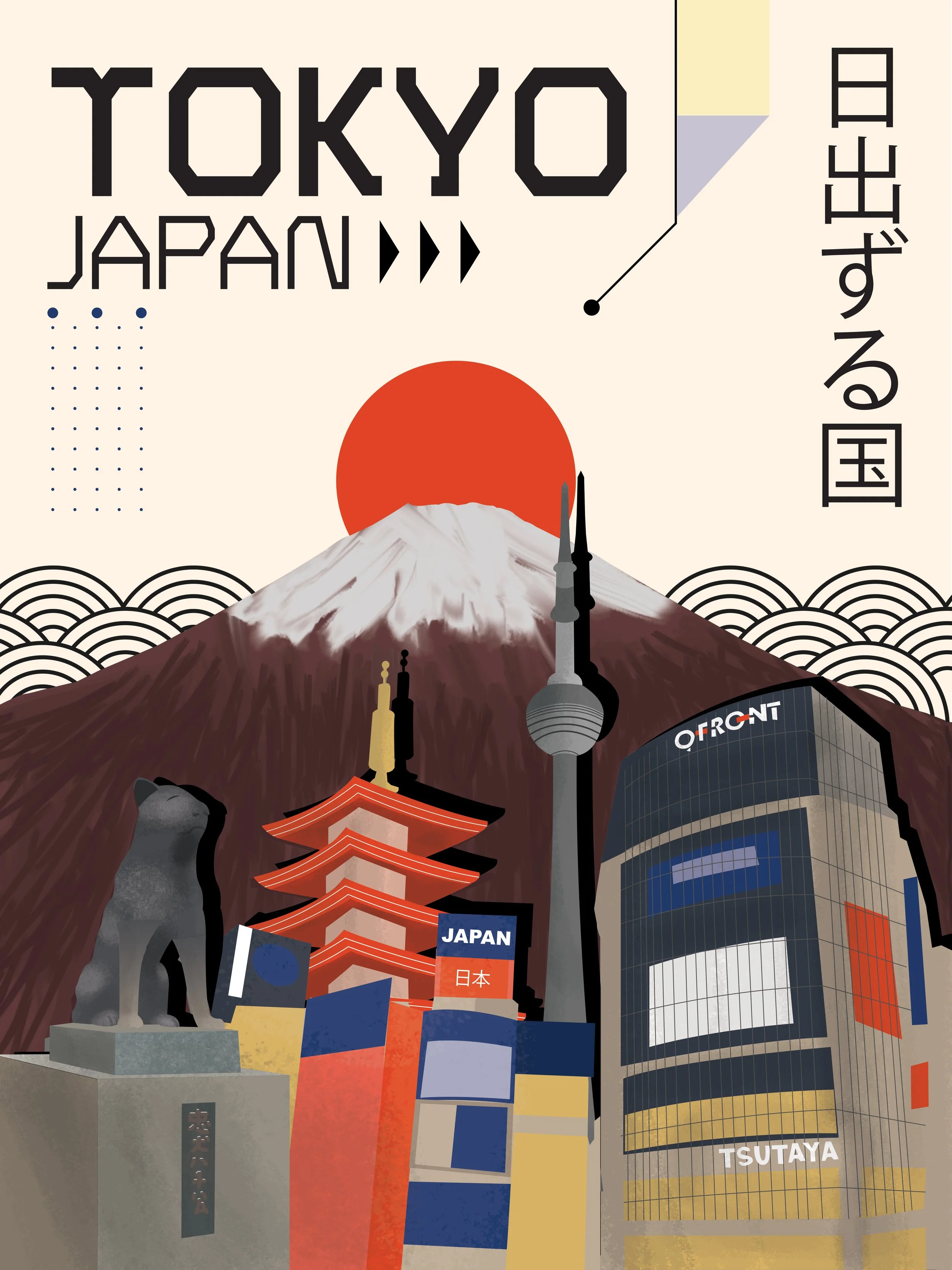 For this assignment, we were tasked with creating a travel poster that featured a style reminiscent to more classical art styles. I chose to do Tokyo, Japan in the Bauhaus style, while incorporating a bit of Futurism into it as well. I believe that this works great, as Tokyo is a city that prides itself in emphasizing the future while not forgetting the past. I tried to emphasize this idea by incorporating a classical Japanese feel to some aspects of the poster, while bringing up current areas of interest. It all comes together to make a poster with a memorable look.
